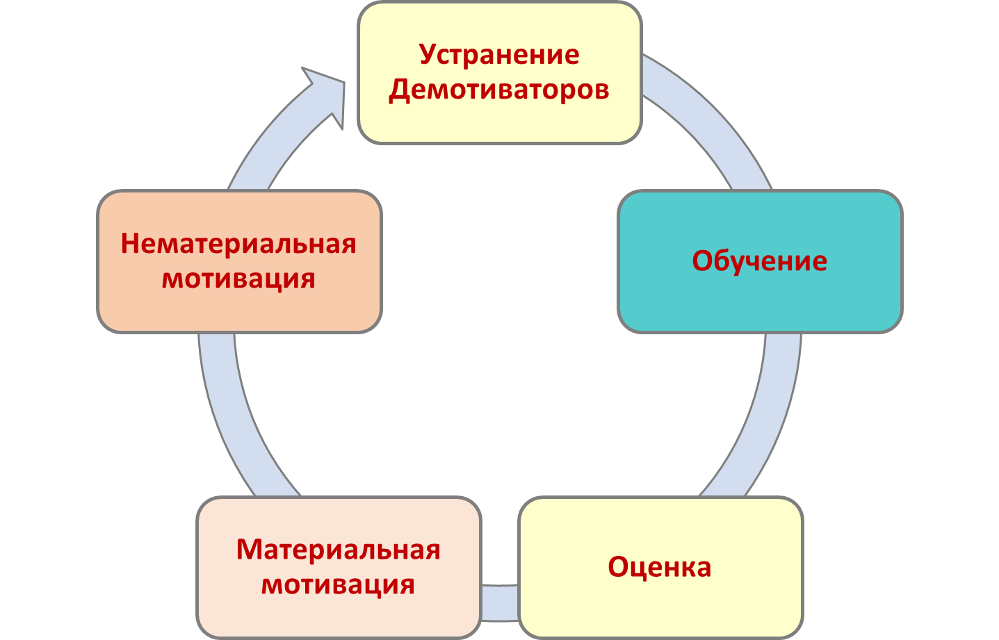 В компании всегда сосуществуют общий, централизованный процесс (цикл) управления и воздействия на персонал и множество процессов, касающихся отдельных подразделений и сотрудников. Общий цикл развития сотрудников представлен на рисунке.